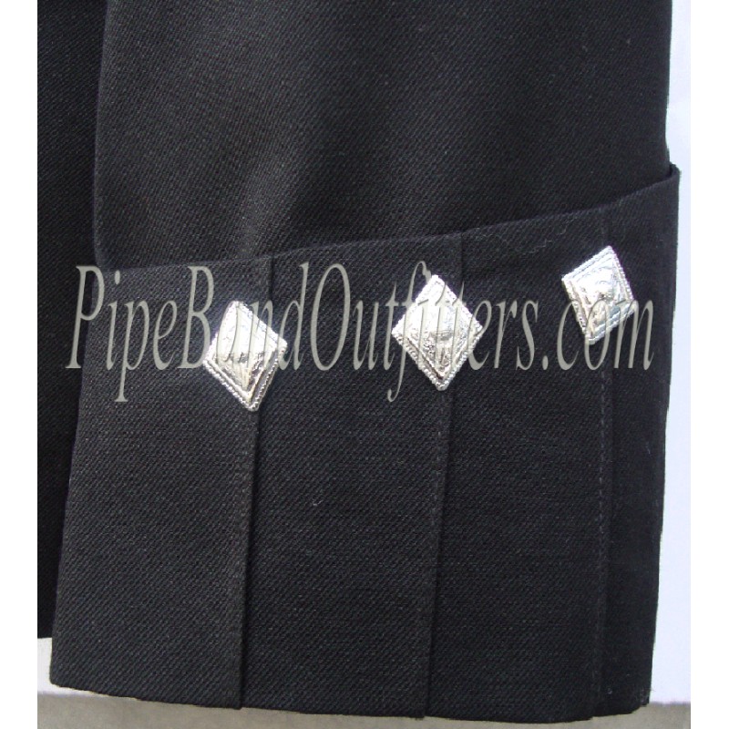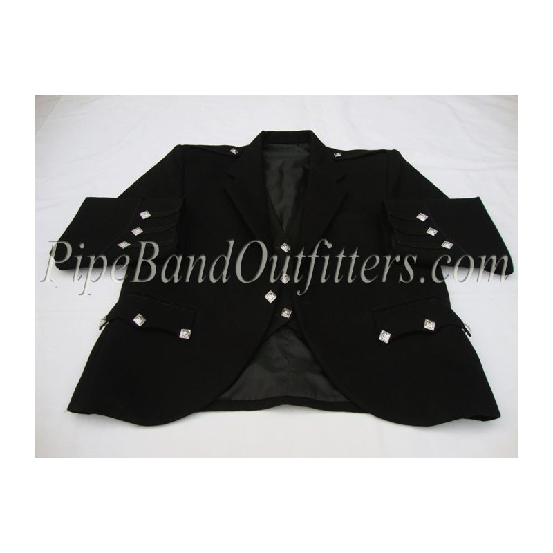 Black wool body, black silk lining, 1 button front closure, 6 buttons cuff, 2 buttons shoulder, 6 buttons pocket flaps, with waist coat...