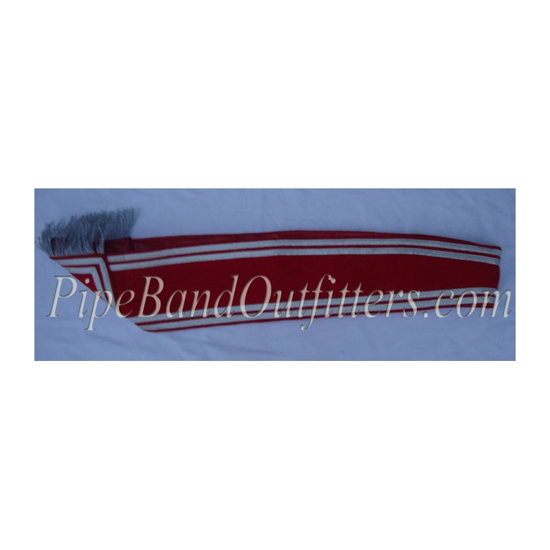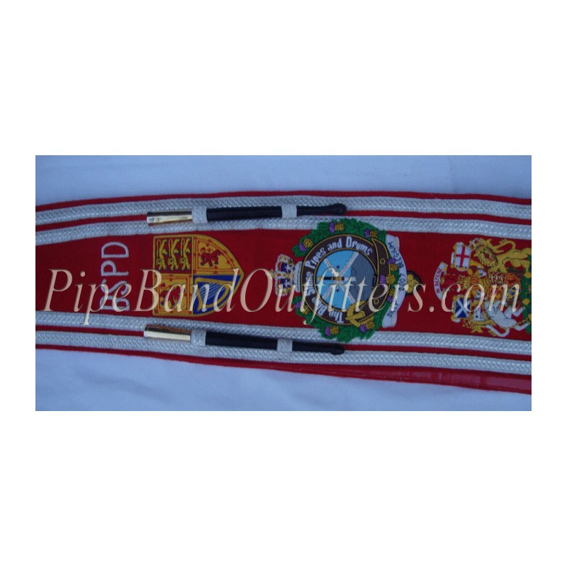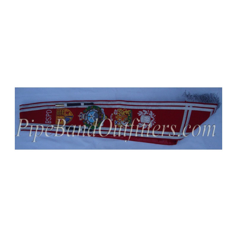 Band Drum Major Solid Red Baldric Sash made for Drum Major of "BLUE STONE PIPES AND DRUMS" with silver fringes and custom made badges on baldric.
