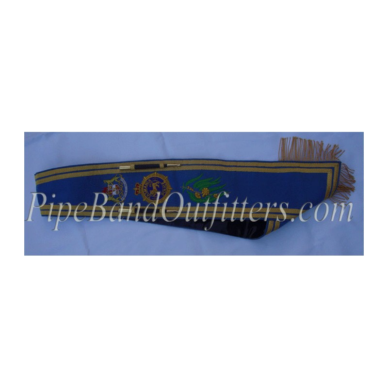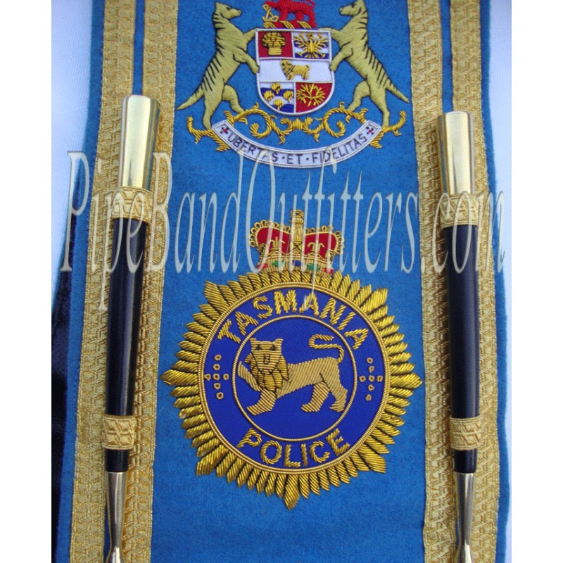 Royal Blue Drum Major Custom Made Baldric made for Drum Major of "TASMANIA POLICE PIPE BAND" in gold fringes and custom made badges on baldric.
