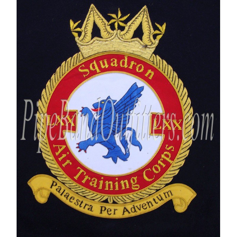 Pipers Band Custom Made Black Banner made for Pipe Band of "AIR TRAINING CORPS" in gold bullion fringes and embroidery custom hand made badge on both sides of the black velvet pipers band banner.