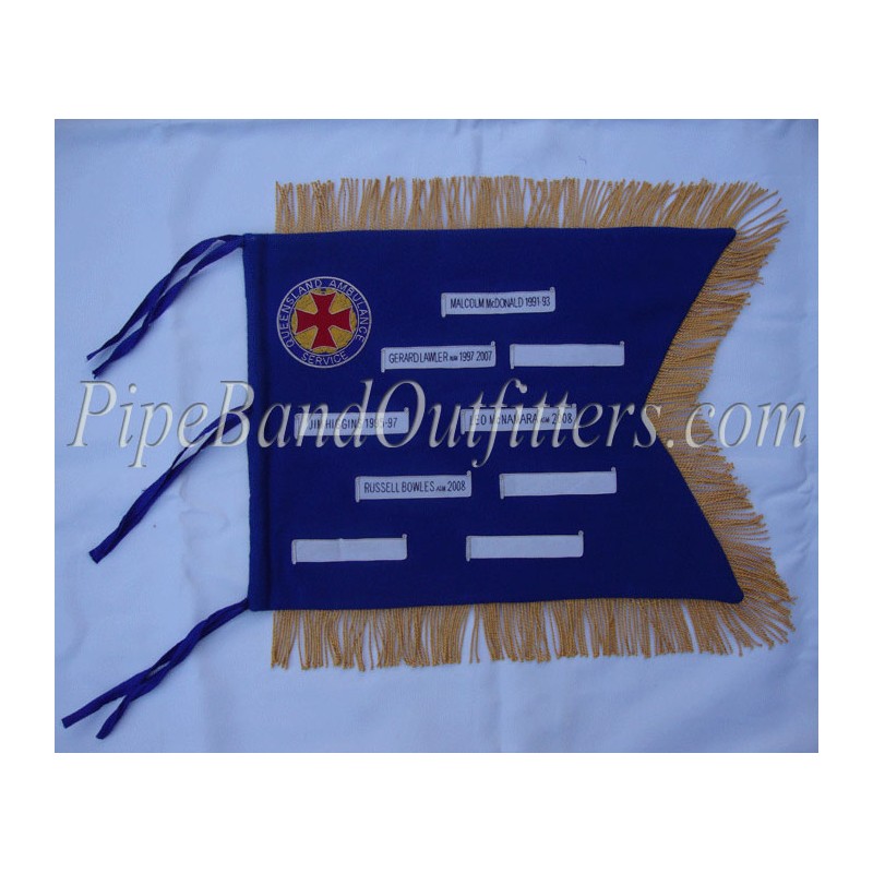 Pipe Major Custom Made Yellow Blue Banner made for Pipe Band of "QWEENSLAND AMBULANCE SERVICES" in gold bullion fringes and custom made embroidered hand made badges and scrolls on Blue Yellow worsted woolen banner.