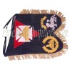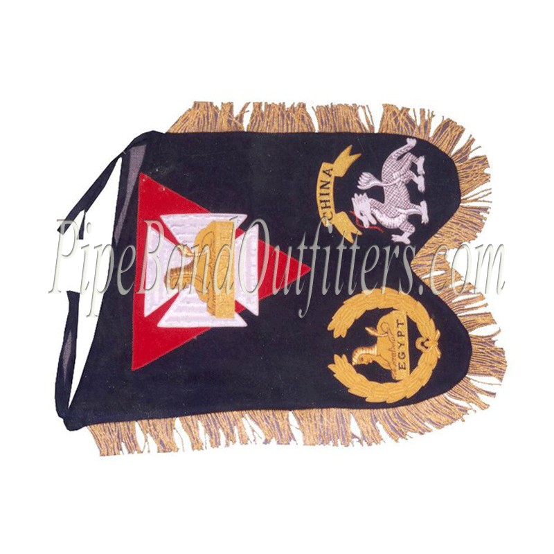 Pipers Drummers Navy Blue Custom Banner made for Pipe Band of "Egypt and China" in gold bullion fringes and hand made custom embroidery badges on piper drummer navy blue velvet banner.