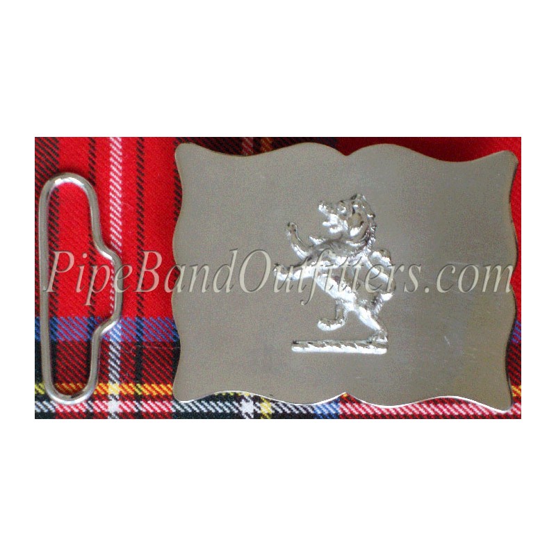Elegantly shaped chrome finish buckle for a kilt belt, with lion rampant design...
