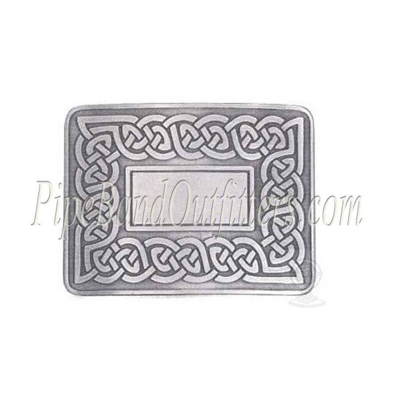 Celtic Waist belt buckle nickel plated celtic design on the front used for pipe band waist belts.
