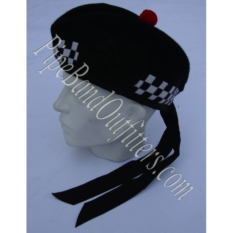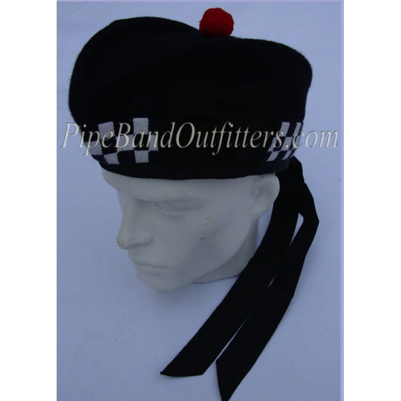 Black wool body, single piece body construction, black & white wool dicing, black silk lining, black silk 1 1/4 inch x 11 inch tail ribbon, black silk backing rosette, hand made wool toorie and pom pom.
