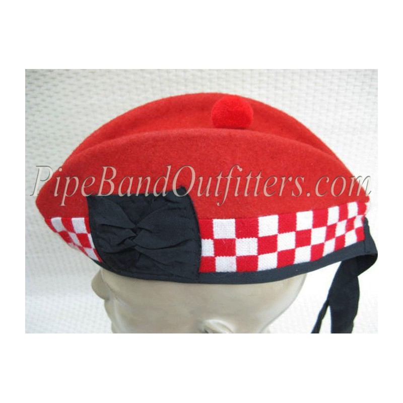 Red wool body, single piece body construction, red & white wool dicing, black silk lining, black silk 1 1/4 inch x 11 inch tail ribbon, black silk backing rosette, hand made wool toorie and pom pom.
