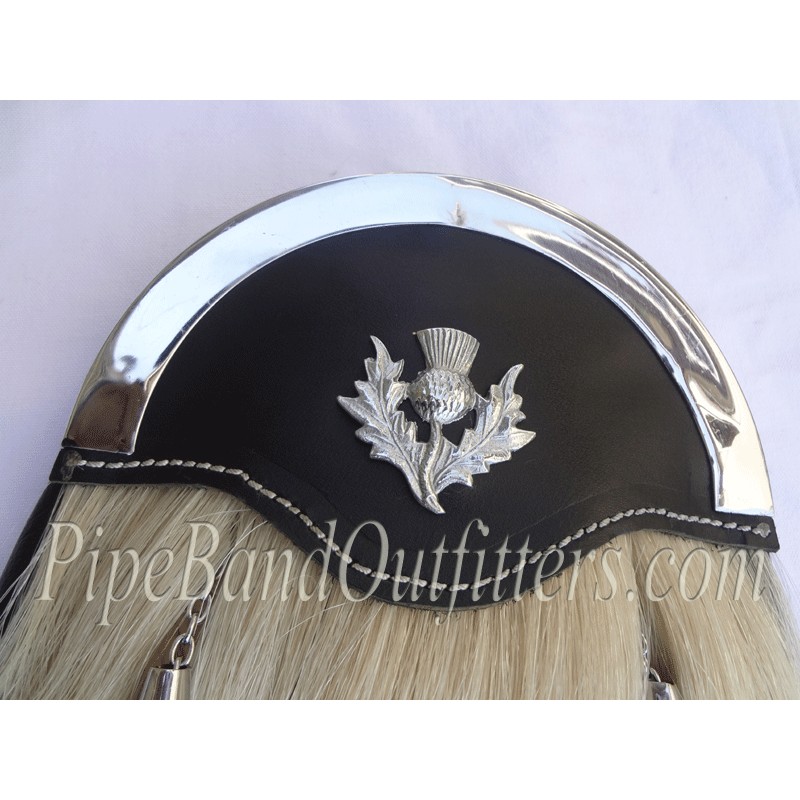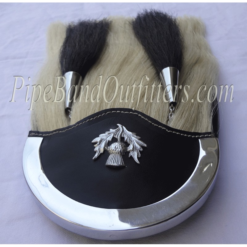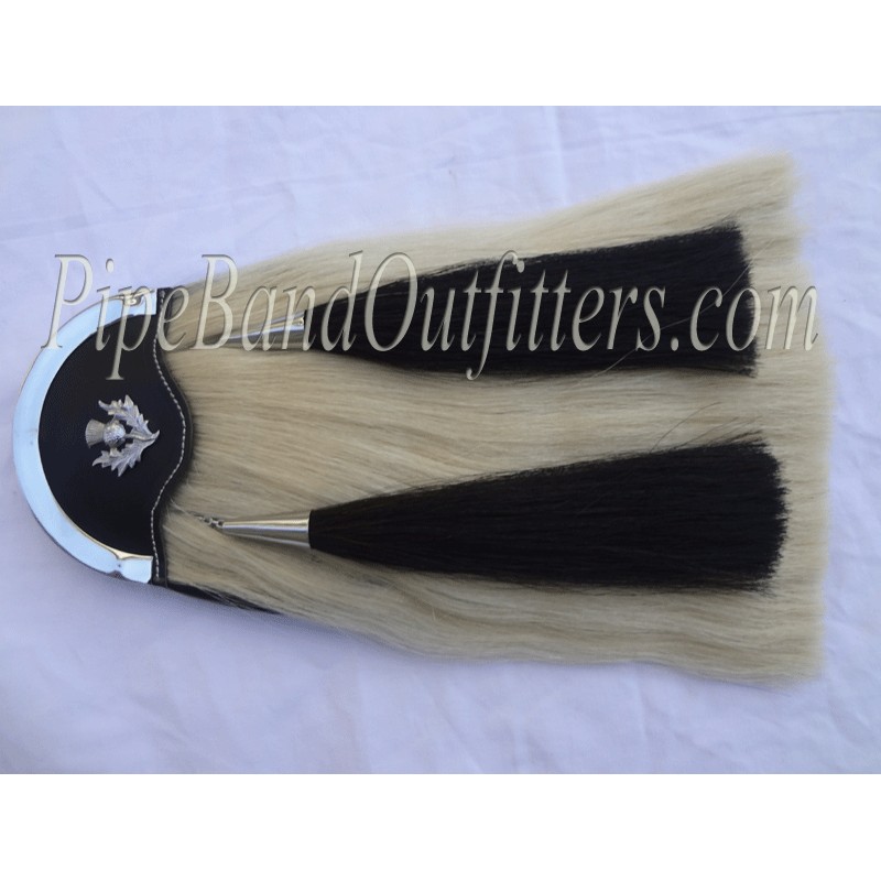 Long horse hair sporran made in pure leather. Original white long horse hair on the front two black long horse hair tassels with chain belt leather strap, any changing possible.