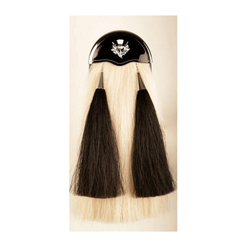 Long horse hair sporran made in pure leather. Original white long horse hair on the front five black horse hair tassels with chain belt, any changing possible.