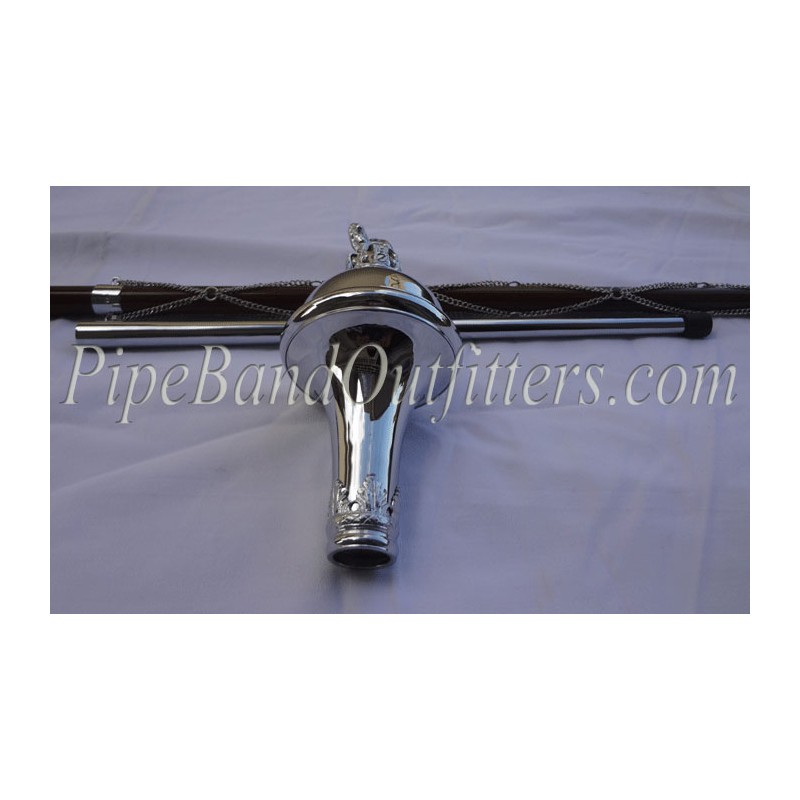 Drum major mace mallaca cane nickel plated chain and nickel plated ferrules with nickel plated trumpet shap head and gold color crown rampart lion on the top of mace. Any changing is possible.