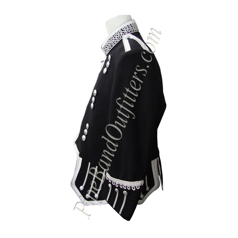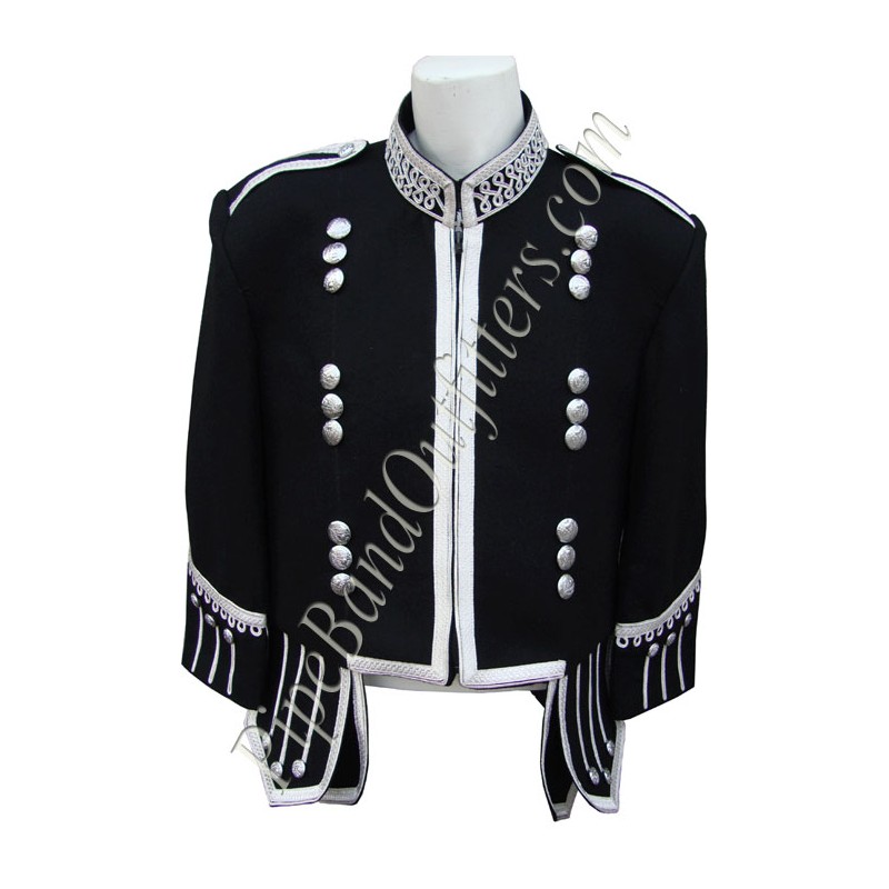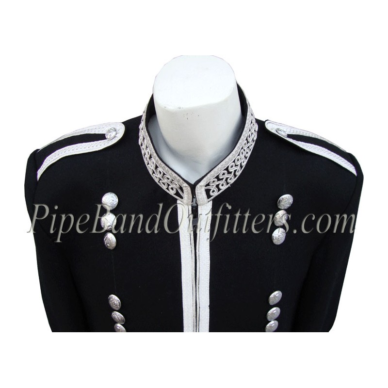 Black wool body, white piping, white braid trim, scrolling white braid trim on cuffs, collar, and shoulder shells, front zip closure, black nylon / silk blend full lining, 2 inch standup collar, made to measure, any changing possible.