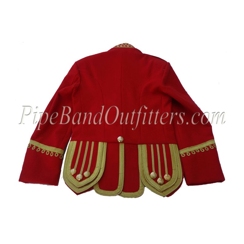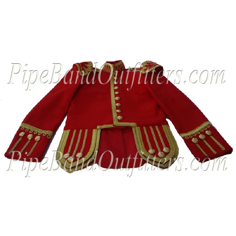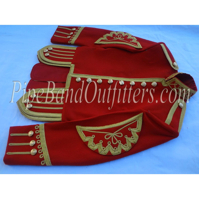 Red wool body, gold piping, scrolling gold braid trim on cuffs, collar, and shoulder shells, 8 buttons front closure, black nylon / silk blend full lining, 2 inch standup collar, 28 medium gold thistle buttons, made to measure, any changing possible.