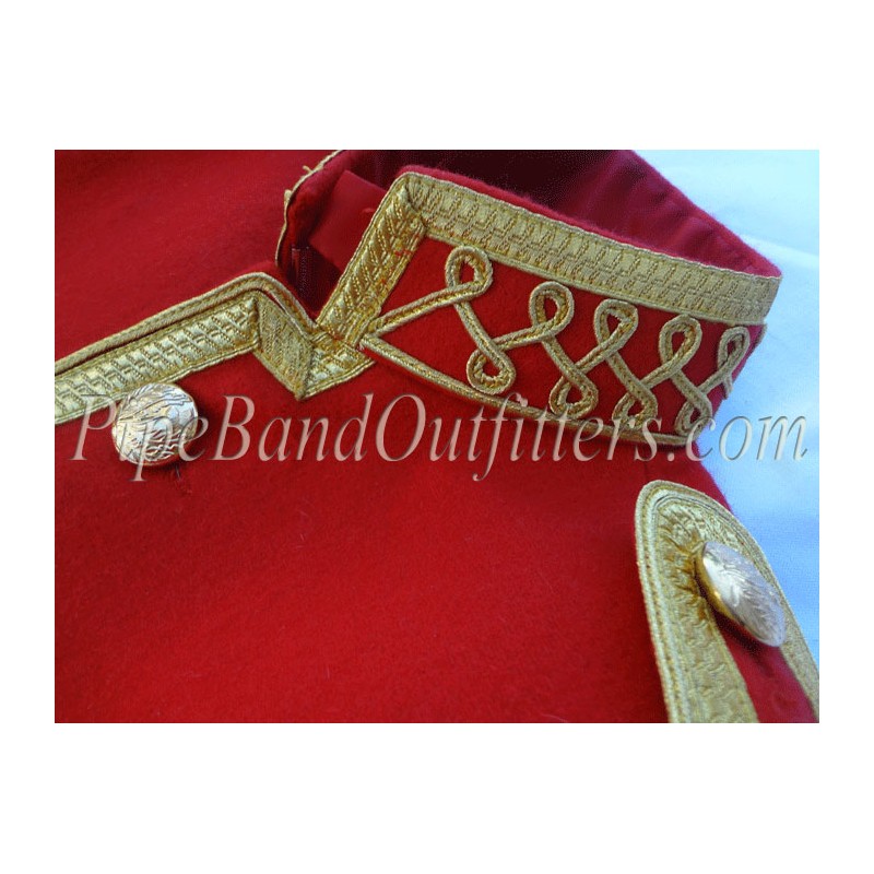 Red wool body, gold piping, scrolling gold braid trim on cuffs, collar, and shoulder shells, 8 buttons front closure, black nylon / silk blend full lining, 2 inch standup collar...
