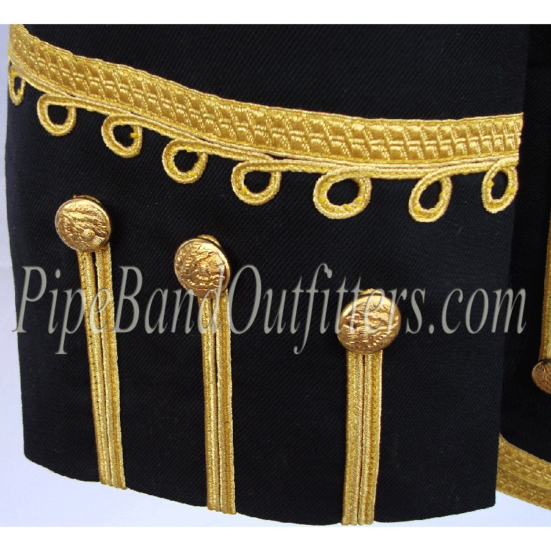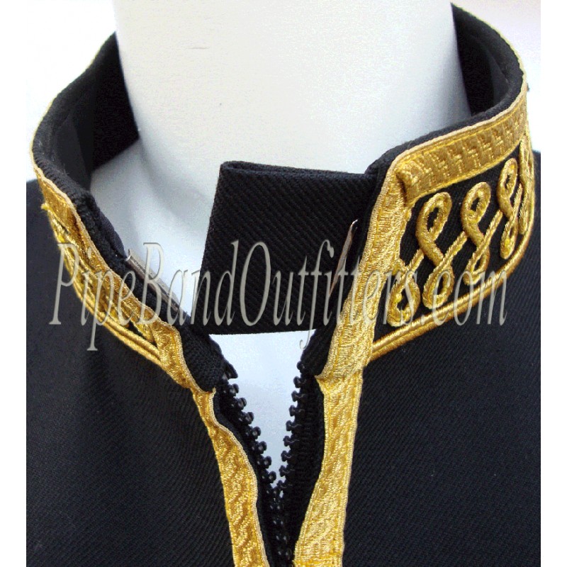 Black wool body, gold piping, gold braid trim, scrolling gold braid trim on cuffs, collar, and shoulder shells, front zip closure, black nylon / silk blend full lining, 2 inch standup collar, made to measure, any changing possible.