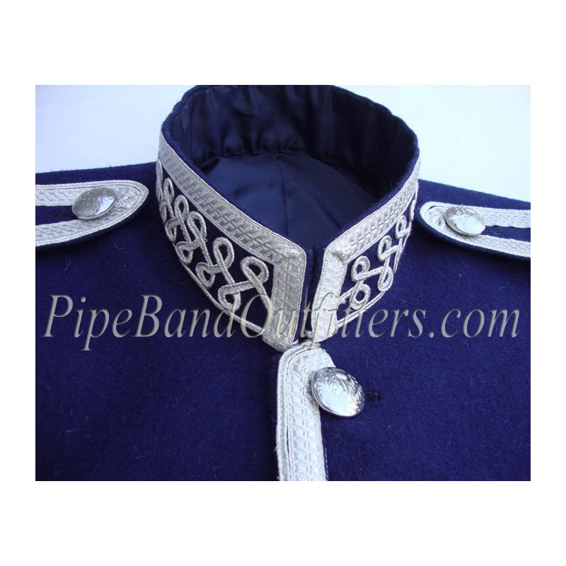 Navy Blue wool body, white piping, white braid trim, scrolling white braid trim on cuffs, collar, and shoulder shells, 8 buttons front closure, black nylon / silk blend full lining, 2 inch standup collar, made to measure, any changing possible.