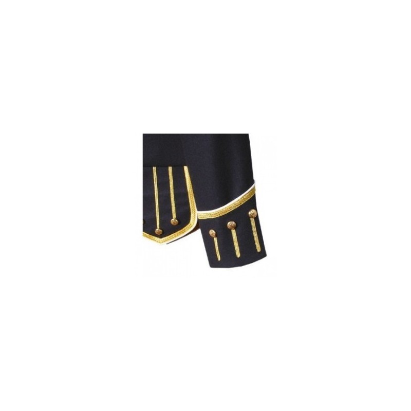 Dark Blue wool body, white piping, 18 button front zip closure, gold braid trim, black nylon / silk blend full lining, 2 inch standup collar, 18 large gold thistle buttons on front, 20 medium gold thistle buttons, Removable 5 bar shoulder shells, made to measure, any changing possible.