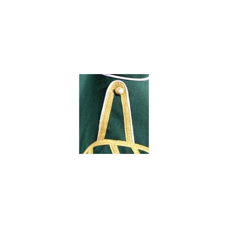 Green wool body, 8 button front closure, gold braid trim, black nylon / silk blend full lining, 2 inch standup collar, 5 bar removeable shells, made to measure, any changing possible.