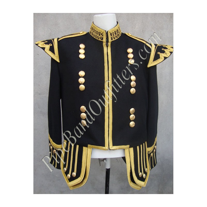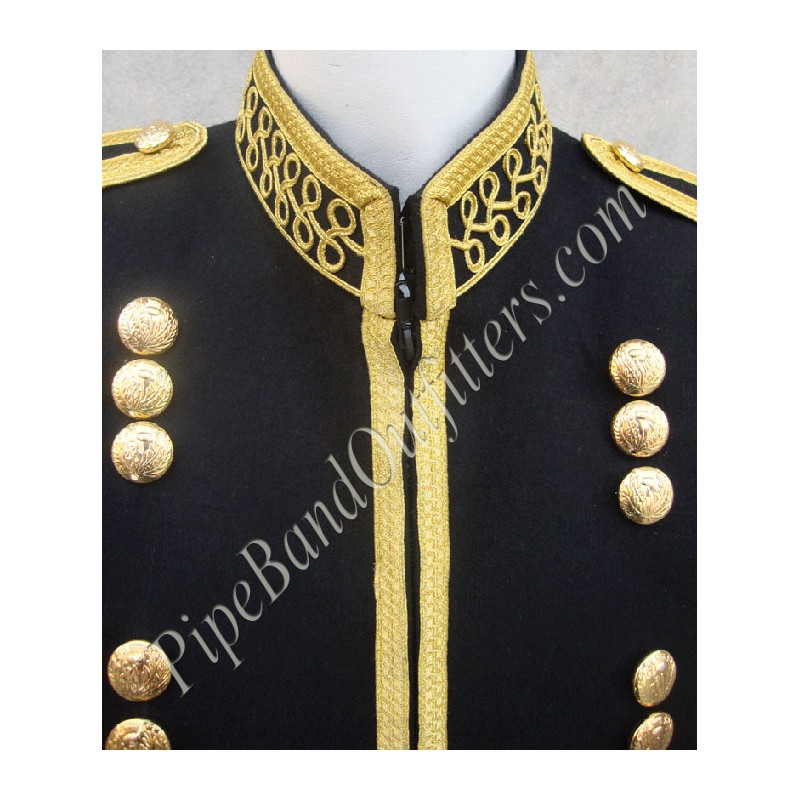 Black wool body, gold piping, gold braid trim, scrolling gold braid trim on cuffs, collar, and shoulder shells, front zip closure, black nylon / silk blend full lining, 2 inch standup collar, made to measure, any changing possible.