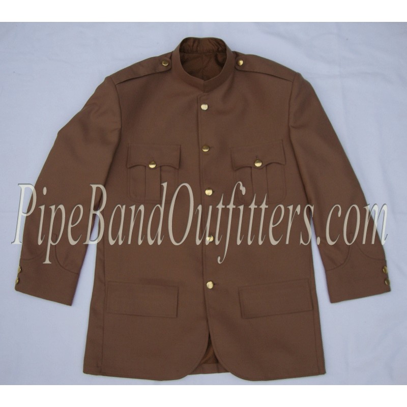 Tan wool body, pleated chest pockets, CEF style 1 3/4 inch standup collar, classic 2 hook collar closure, 5 medium gold thistle button front, cutaway front, black nylon / silk blend full lining, inside left pocket, any changing possible.