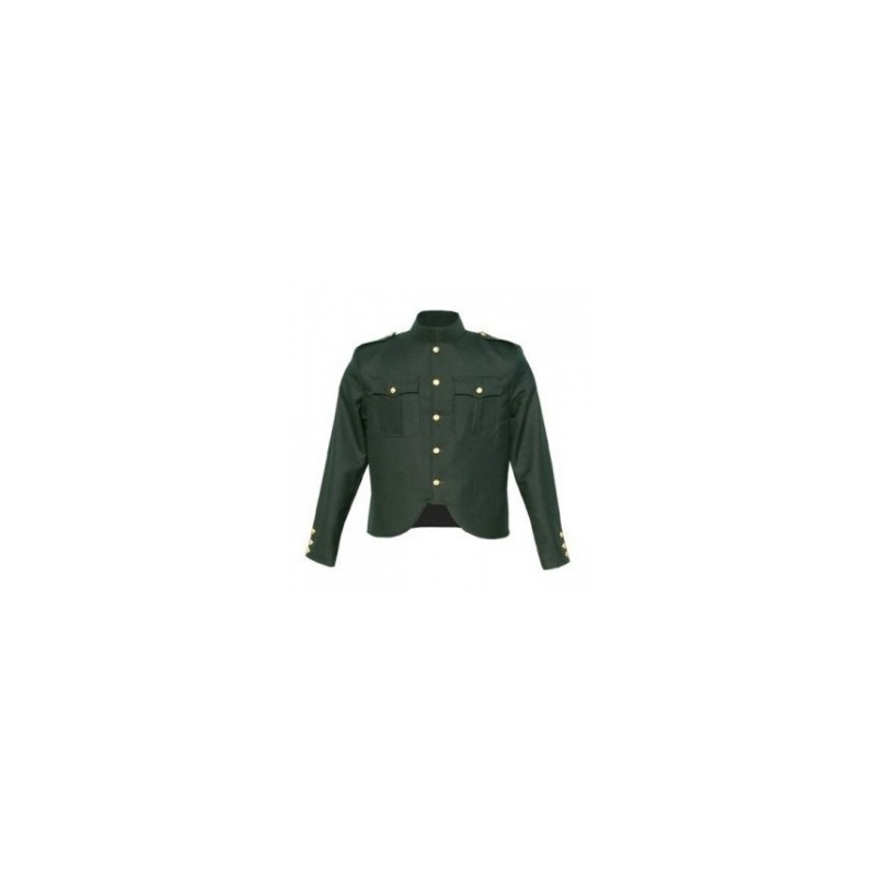 Rifle Green wool body, pleated chest pockets, 5 medium gold thistle button front, 3 buttons on cuffs, cutaway front, black nylon / silk blend full lining, inside left pocket, 2 inch standup collar, any changing possible.