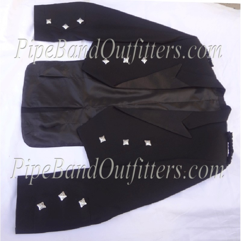 Black wool body, black nylon / silk blend full lining, 6 front diamond thistle buttons, 6 cuff buttons, 6 back buttons, 2 buttons shoulder, any changing possible.